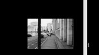 What follows is the first of two films-within-the-film, shot in color at two busy traffic intersections in Brussels. These moving-image scenes, silent and running 12 and 14 seconds, respectively, were captured with a stationary camera and bear formal hallmarks of Downsbrough’s still photographs—most notably, the latter’s vertically divided frames. The color videos bracket a briskly-paced, achronological sequence of twenty-three black-and-white still images selected from photographs Downsbrough took of transportation corridors (mostly streets, but also riversides, a canal, a train station, an airport, and a small, empty parking lot) in cities. Four of the first six frames in the sequence, including two black screens, each carry a word that, in order of presentation, contributes to the phrase PLACE AS TIME AND. (These same words, minus AND, are reversed in the video’s final still.) The appearance of AND on a black screen is accompanied by the cheerful beep of a horn heard over the sound of traffic, as if joyfully heralding the forthcoming flow of images. Ten frames further on, another black screen among the stills bears the words AND (top center), UNTIL (right center), and THEN (mirror image, bottom center). Read as a phrase, the words provide a temporal bridge between the preceding and following images, which are shown in silence until a final burst of traffic noise breaks through toward the end.